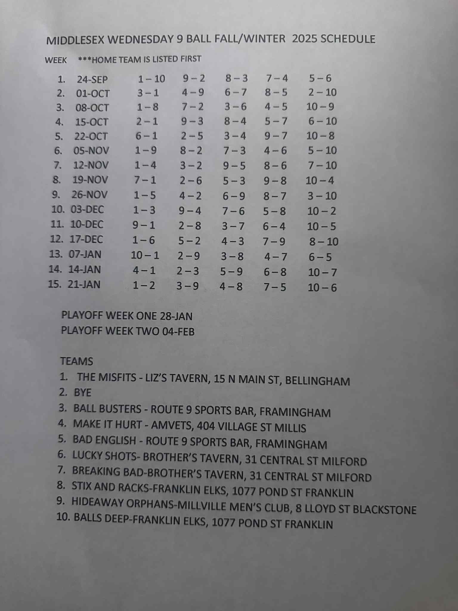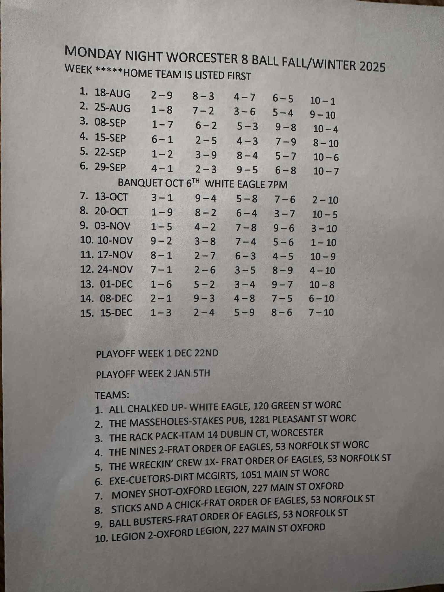 Schedules for Worcester County Tap See the current schedules by clicking on the expandable boxes below. Worcester Sunday 9 Ball Schedule WORCESTER SUMMER 2025 SUNDAY 9 BALL SCHEDULE Worcester Monday 9 Ball Schedule WORCESTER SPRING 2025 MONDAY 9 BALL SCHEDULE Worcester Monday 8 Ball Schedule WORCESTER FALL/WINTER 2025 MONDAY NIGHT 8 BALL SCHEDULE Middlesex Monday 8 Ball Schedule MIDDLESEX FALL/WINTER 2025 MONDAY 8 BALL SCHEDULE Green Room Tuesday 8 Ball Schedule GREEN ROOM FALL/WINTER 2025 TUESDAY 8 BALL SCHEDULE Worcester Tuesday Scotch Doubles 8 Ball Schedule WORCESTER SUMMER 2025 TUESDAY SCOTCH DOUBLES 8 BALL SCHEDULE Middlesex Wednesday 9 Ball Schedule MIDDLESEX TAP FALL WINTER 2025 WEDNESDAY 9 BALL SCHEDULE Worcester Thursday 8 Ball Schedule WORCESTER SUMMER 2025 THURSDAY 8 BALL TEAM SCHEDULE Click here to view Schedules Business Directory Traveling Team Tournament Info Schedules for Worcester County Tap TAP Player Statistics Follow Us Facebook
